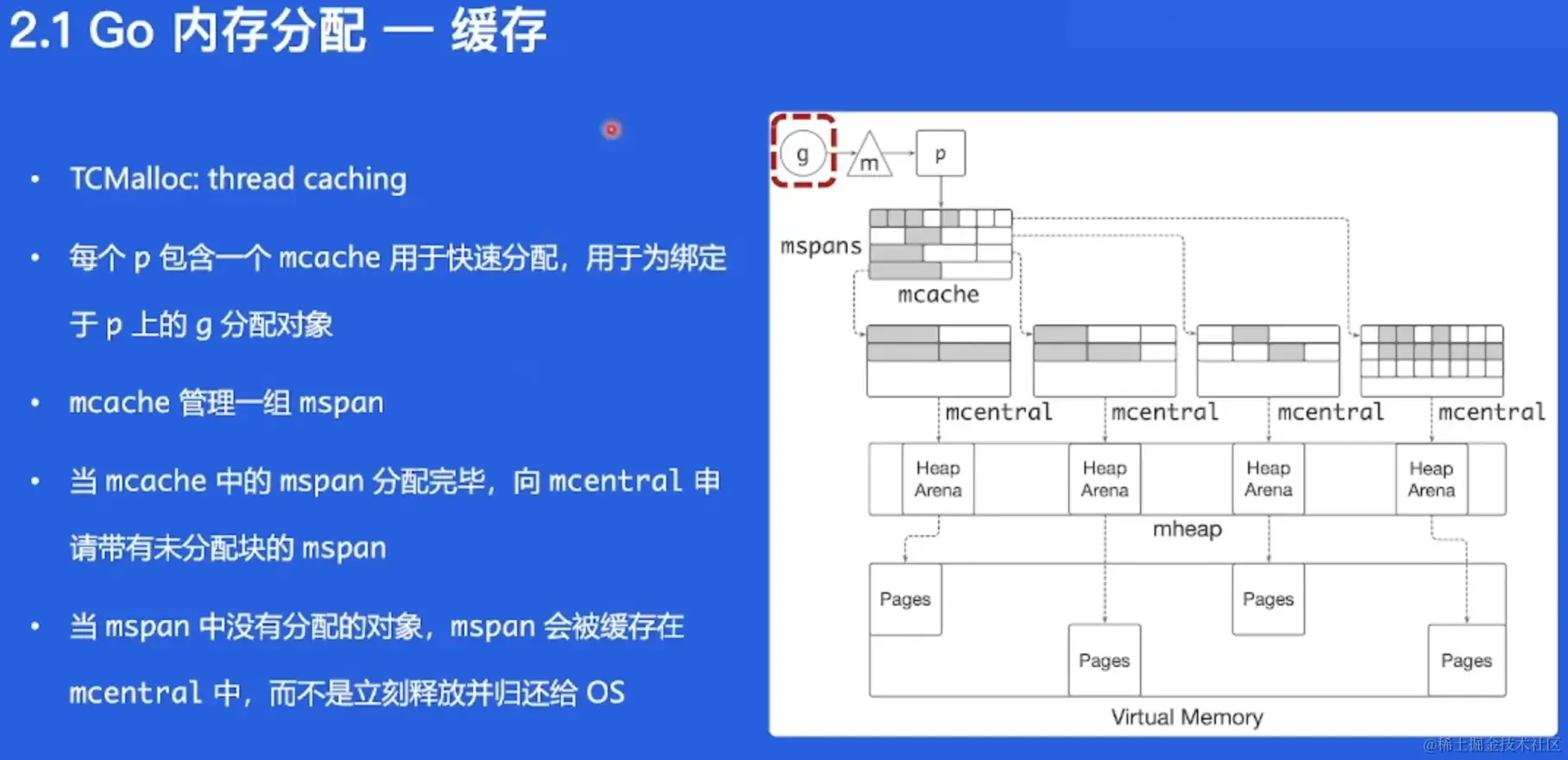 内存分配是一个复杂问题,GO程序启动会申请一大块内存,然后又成三个大块,然后又是mspan小块,mcache, mcentral, mheap是Go内存管理的三大组件,层层递进。小对象和大对象的分配比较特殊。