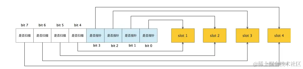 bitmap的大小有arena决定的,bitmap用于标识area区域中一个byte对应arena中的4个指针(指针大小8B),所以bitmap大小为512GB/(4*8B)=16GB.