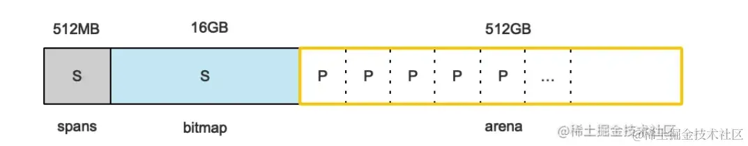 GO程序在启动的时候向操作系统申请一个内存,将申请到的内存分配为三个大区域512MB,16GB,512GB。