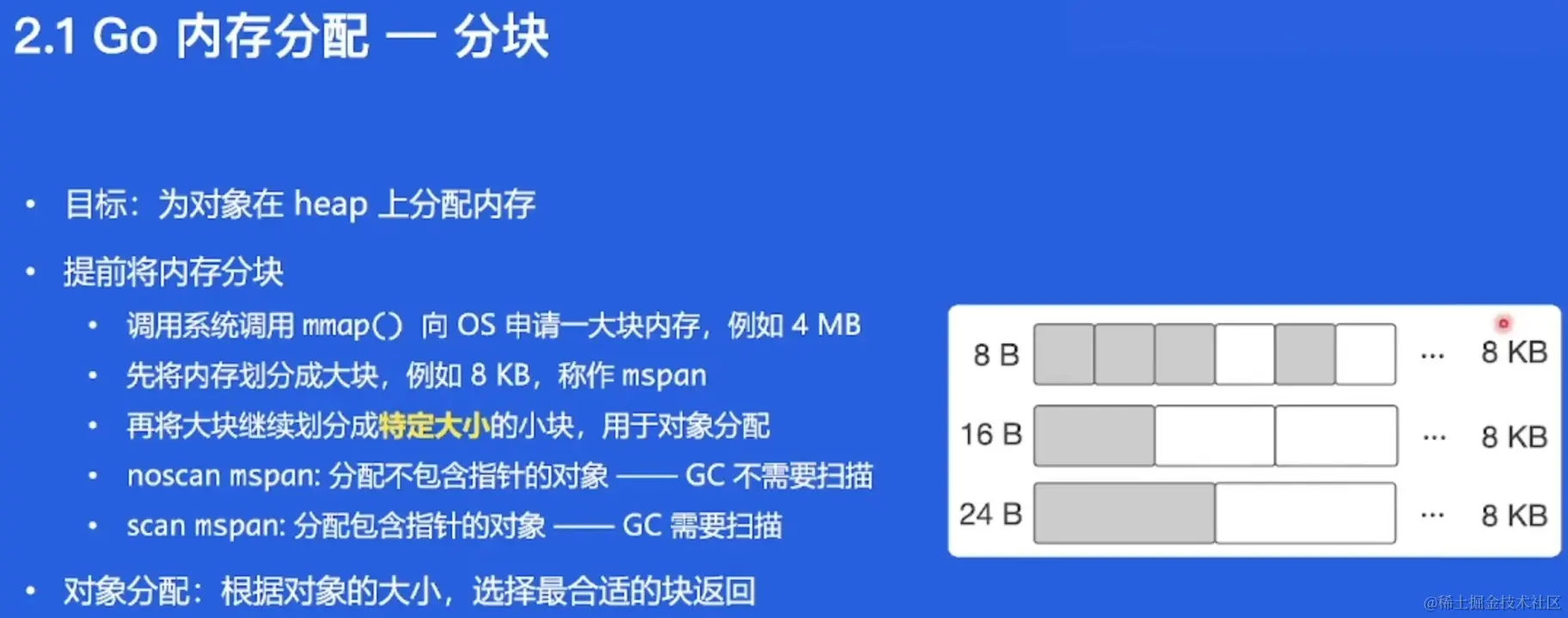 Go中内存管理的基本单元,是由一片连续的8KB的页组成的大块内存。mspan是双端链表的结点。mspan中存放object,根据每种object的大小不同,又可以给mspan分为很多类,object大小相近的放在一起,大对象的存储可以在堆上直接分配。