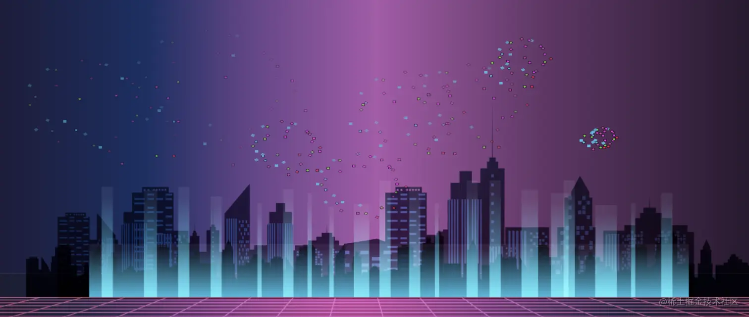 使用CSS的 background 仅有的特效属性linear-gradient与 radial-gradient画满整个div,实现烟花粒子效果。再配合animation将div不断放大,实现烟花绽放的效果。