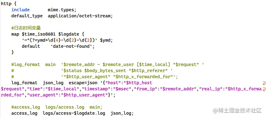 log_format json_log escape=json '{"host":"$http_host $request","time":"$time_local","timestamp":"$msec","from_ip":"$remote_addr","real_ip":"$http_x_forwarded_for","user_agent":"$http_user_agent"}';