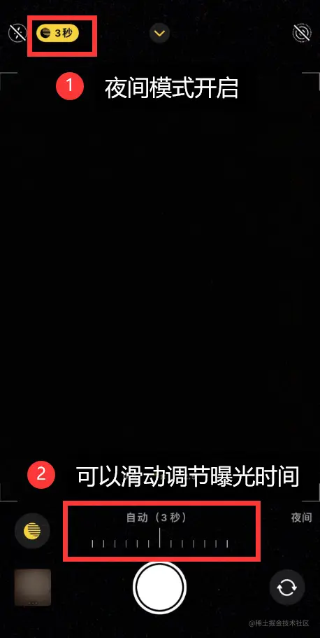 **步骤2:**等待“月亮”图案变成黄色的时候,就打开了照相机夜间模式的功能。小伙伴可以在下面选择【自动调节】或者手动调节曝光时间。