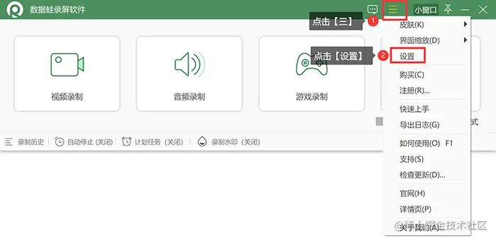 **步骤1:**双击已经下载好的数据蛙录屏软件,进入软件主界面后,点击上方类似“三”的图案,接着点击选项栏中的【设置】。