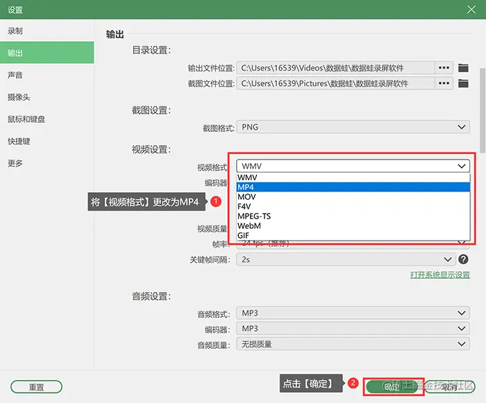 **步骤2:**进入设置界面后,将【视频格式】更改成MP4,接着点击下方的【确定】完成设置。