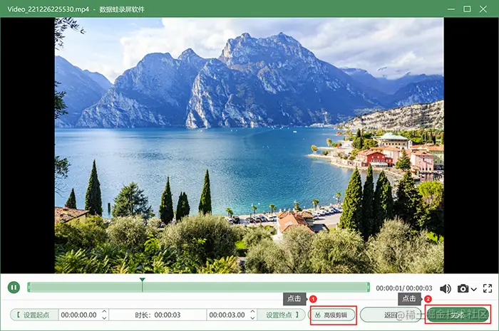 **步骤5:**录制结束后,在【预览窗口】对录制的MP4格式的视频文件进行浏览观看,接着点击下方的【完成】对MP4格式的视频文件进行保存。