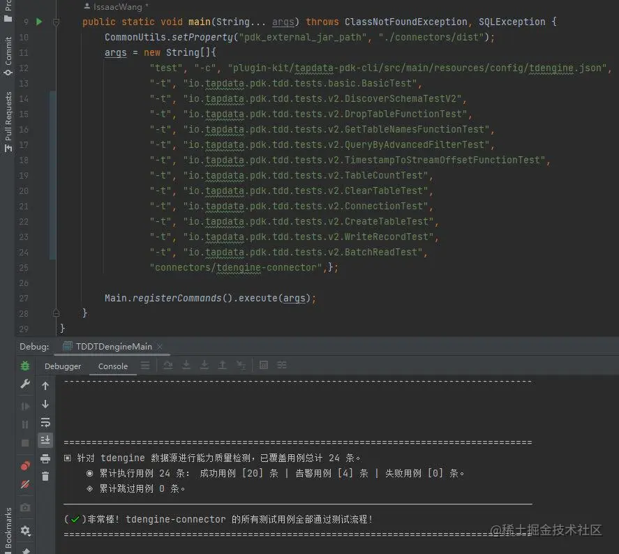 我们的首位外部开发者在数据源 TDengine 的测试环节,就跑完了包括在线联调 P0 测试,以及 TDD 段元测试的全流程。