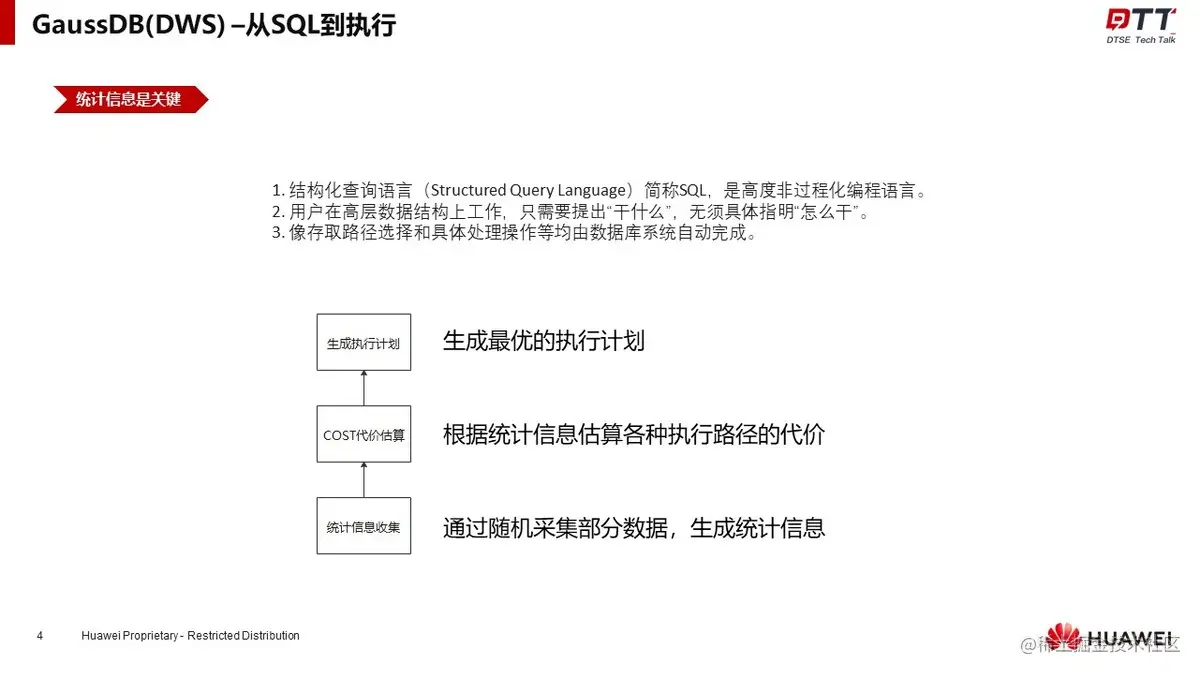 王跃先带我们简单了解了GaussDB(DWS)的部署架构,说明了分布式查询的执行流程和统计信息收集的执行流程。