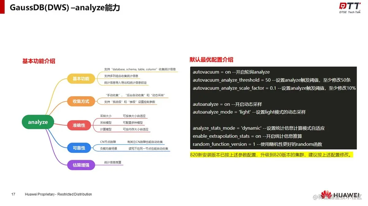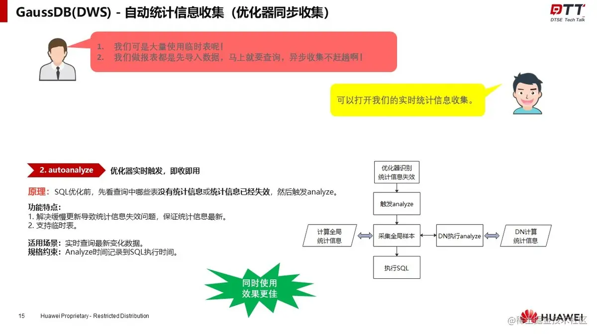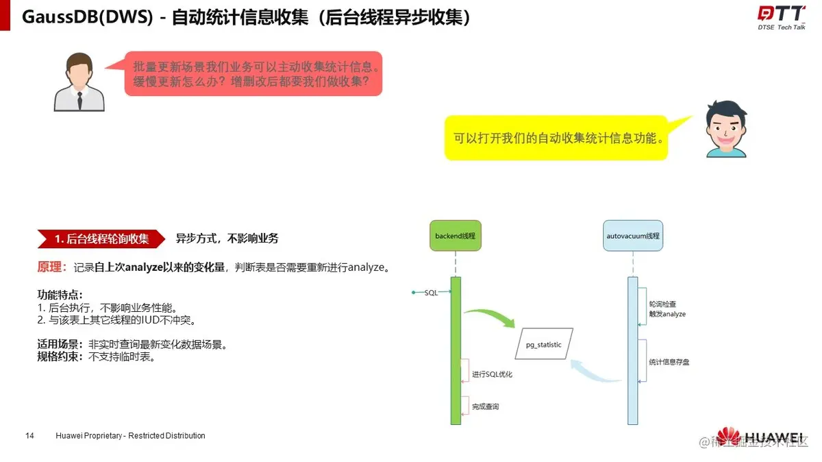 GaussDB(DWS)拥有强大的统计信息自动收集能力,通过后台线程轮询收集与优化器同步收集两种方式来实现。王跃建议开发者可以同步开启两种方式,以达到最优的收集功能。