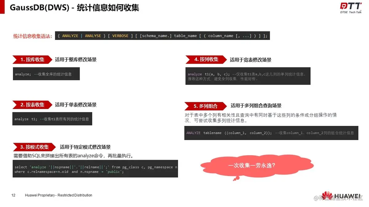 基于此,GaussDB(DWS)共有五种统计信息收集的方法,分别是按库收集、按表收集、按模式收集、按列收集以及多列组合。