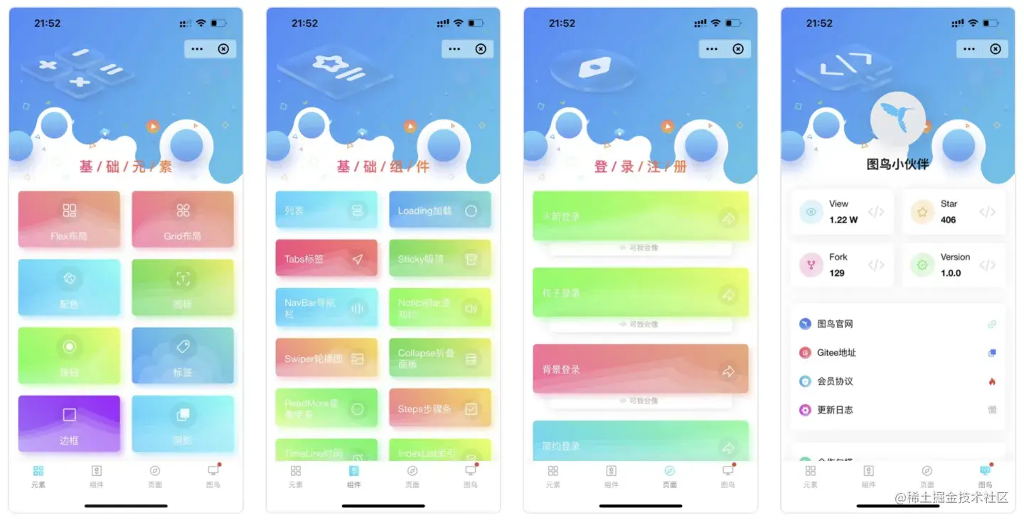 UI组件是小程序开发中非常常用的。图鸟UI是一个UI框架,提供丰富的组件进行快速开发,已经支持H5和微信小程序,包含常用表单组件、信息展示组件等,并提供丰富的酷炫页面模板。