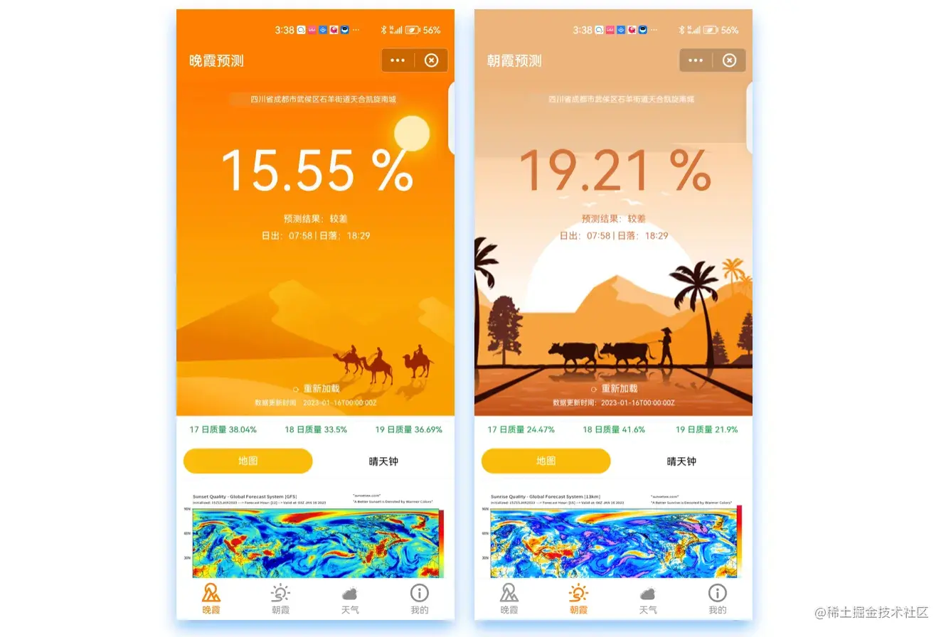 提供预测未来几天的晚霞和朝霞出现概率,让您及时、准确、全面地为拍摄做好充分准备。
