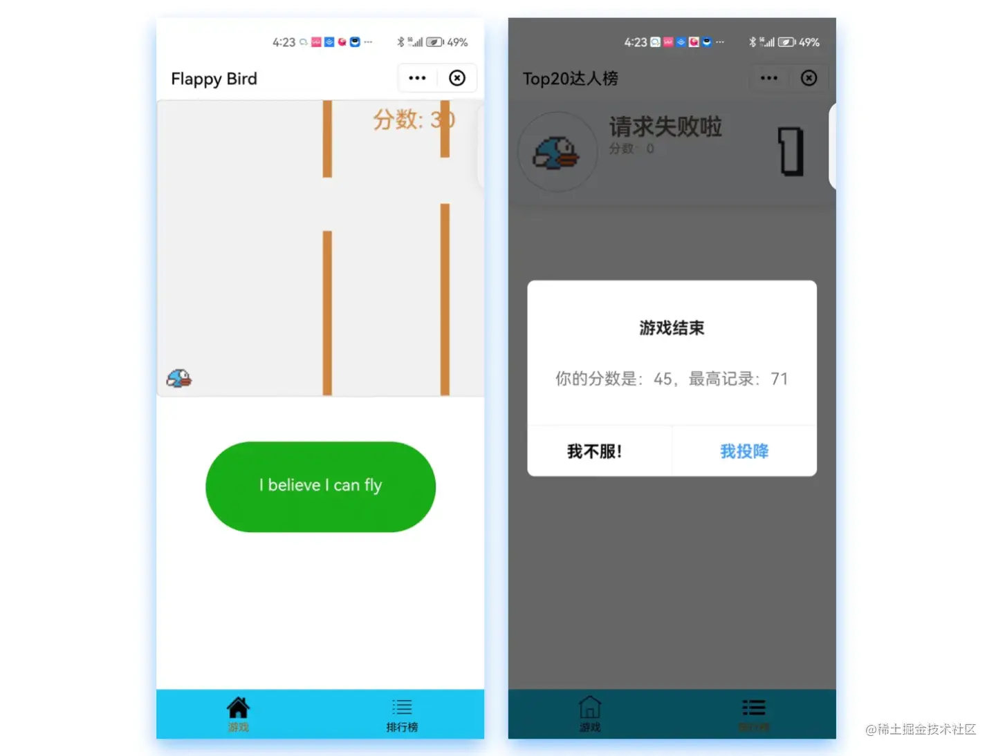 《Flappy Brid》是一款小程序游戏,游戏中玩家只需通过点击方向键操纵让小鸟避开绿色管道等障碍物即可继续前进,如果小鸟碰到管道,游戏便会立即结束。你可以让小鸟得多少分呢?