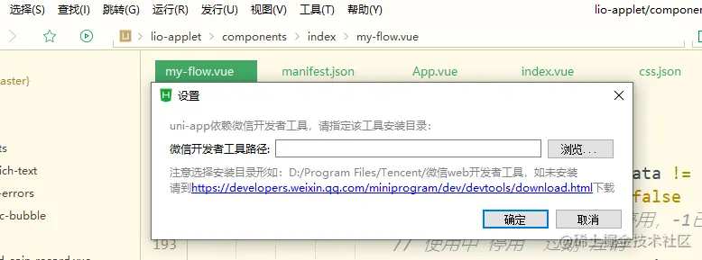 填写微信开发者工具路径,点击【确定】,如下图所示: