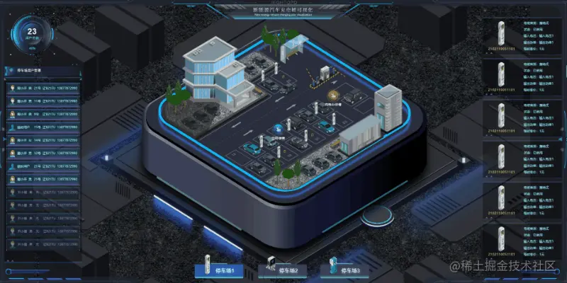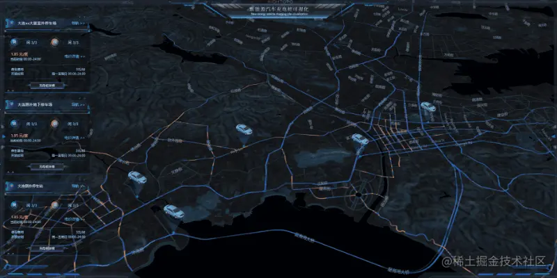初始页面场景设置了以新能源汽车载入的风格。并选用醒目的高亮流光效果,聚焦视野至关键交通枢纽。结合 GIS 地图,以城市地图为背景,辅以 2D 面板进行可视化展示。分别从充电管理、告警管理、智慧路线规划等层面,对充电站运营进行优化整合,全方位掌控停车场运行状况,及时做出运营策略调整。