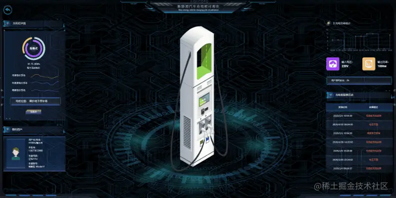 图扑软件 HT 数据可视化平台以充电站的充电桩等相关设备为可视化对象,基于三维沉浸式实体建模和信息数据的虚拟仿真技术,通过大屏幕互动,实现多功能充电站设备运行和充电服务的沉浸式全方位可视化监控,并利用 Web3D 技术实现对象数据的远程实时浏览。