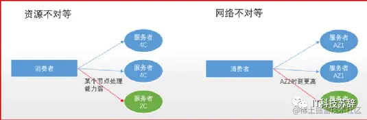 实例不对等通常有很多原因。在资源受限的场景,可能部分实例使用处理能力相对比较弱的资源。在高可用场景,不同的AZ的时延也存在差异。资源不对等场景触发故障的主要原因是处理能力比较弱的实例会拖慢系统总体的处理能力,需要有合理的机制在实例之间调度请求的执行。