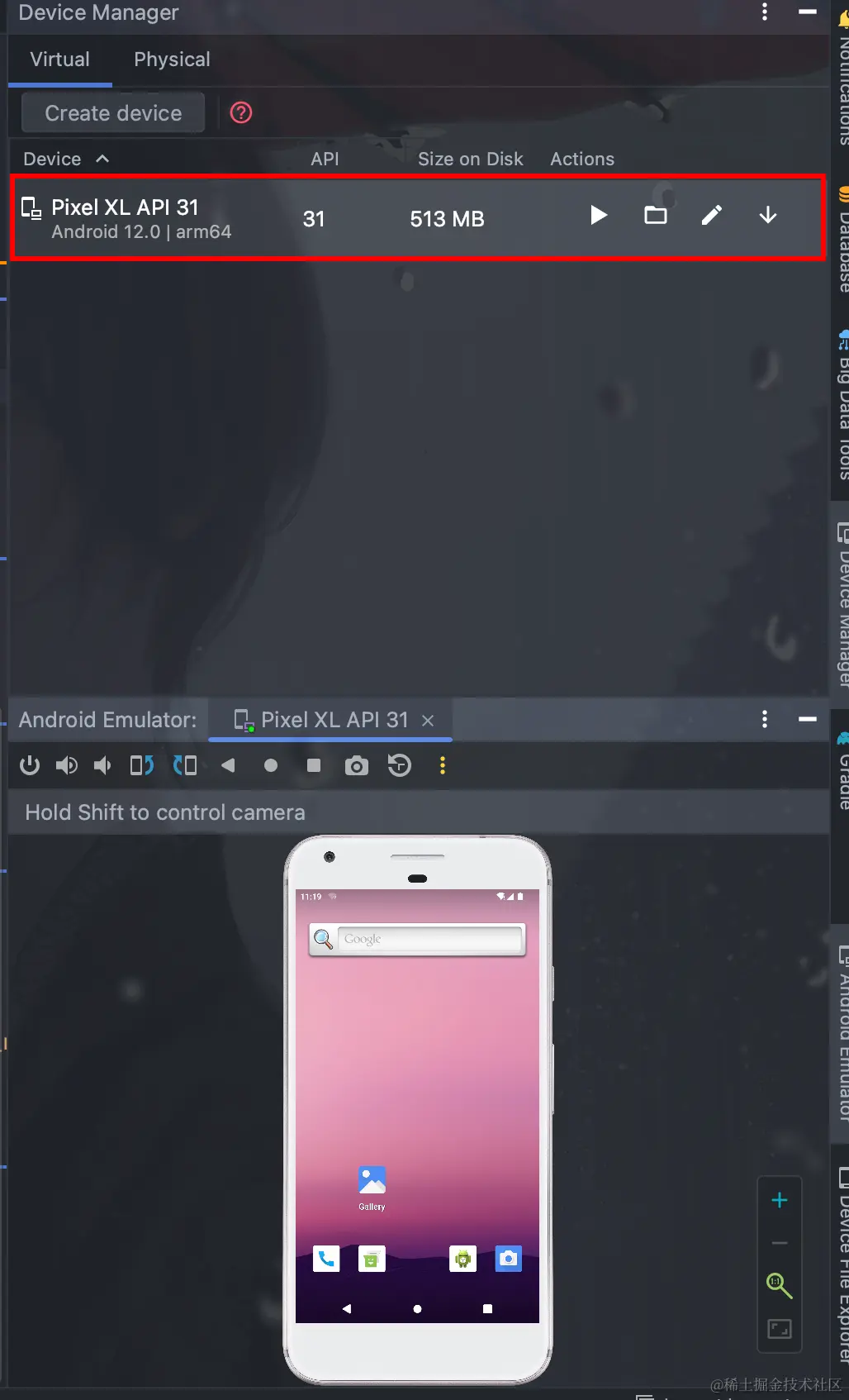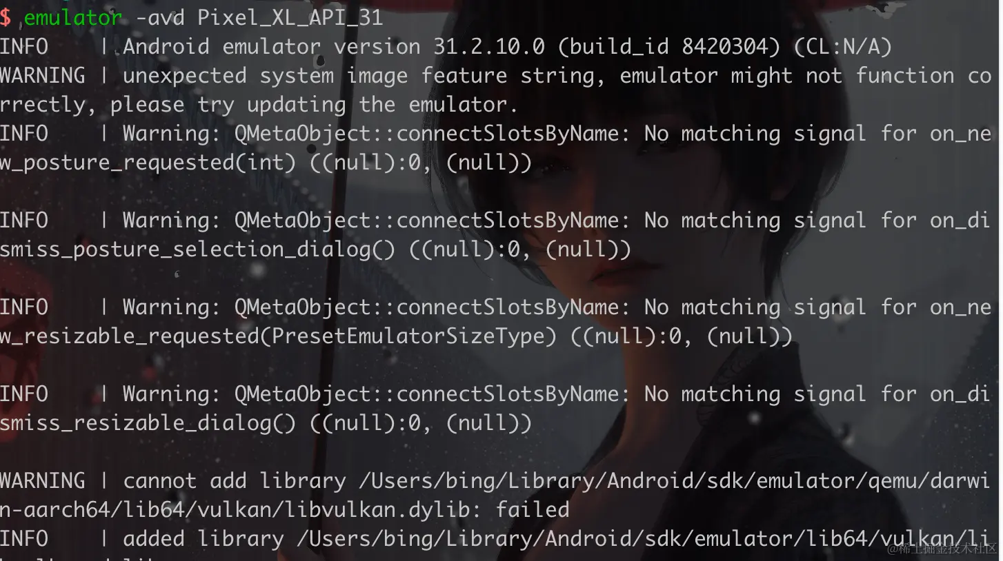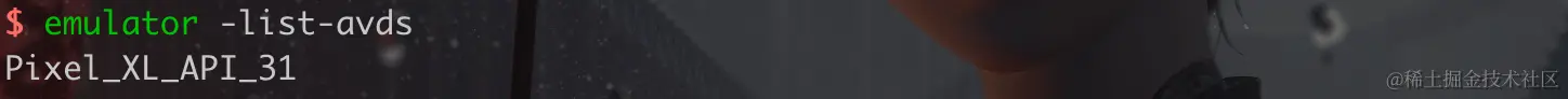- 在终端中执行 emulator -avd Pixel_XL_API_31 运行 Pixel_XL_API_31 模拟器实例。