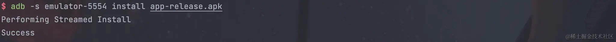 - 输入adb -s emulator-5554 install app-release.apk安装APP。其中-s指定了设备,install之后需要写APP位置。