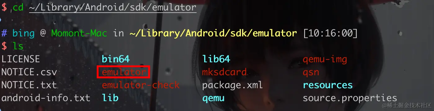 - 笔者在~/Library/Android/sdk/emulator 目录下找到了 一个名为 emulator 的可执行文件,经过多方资料验证,此为模拟器的CLI程序。