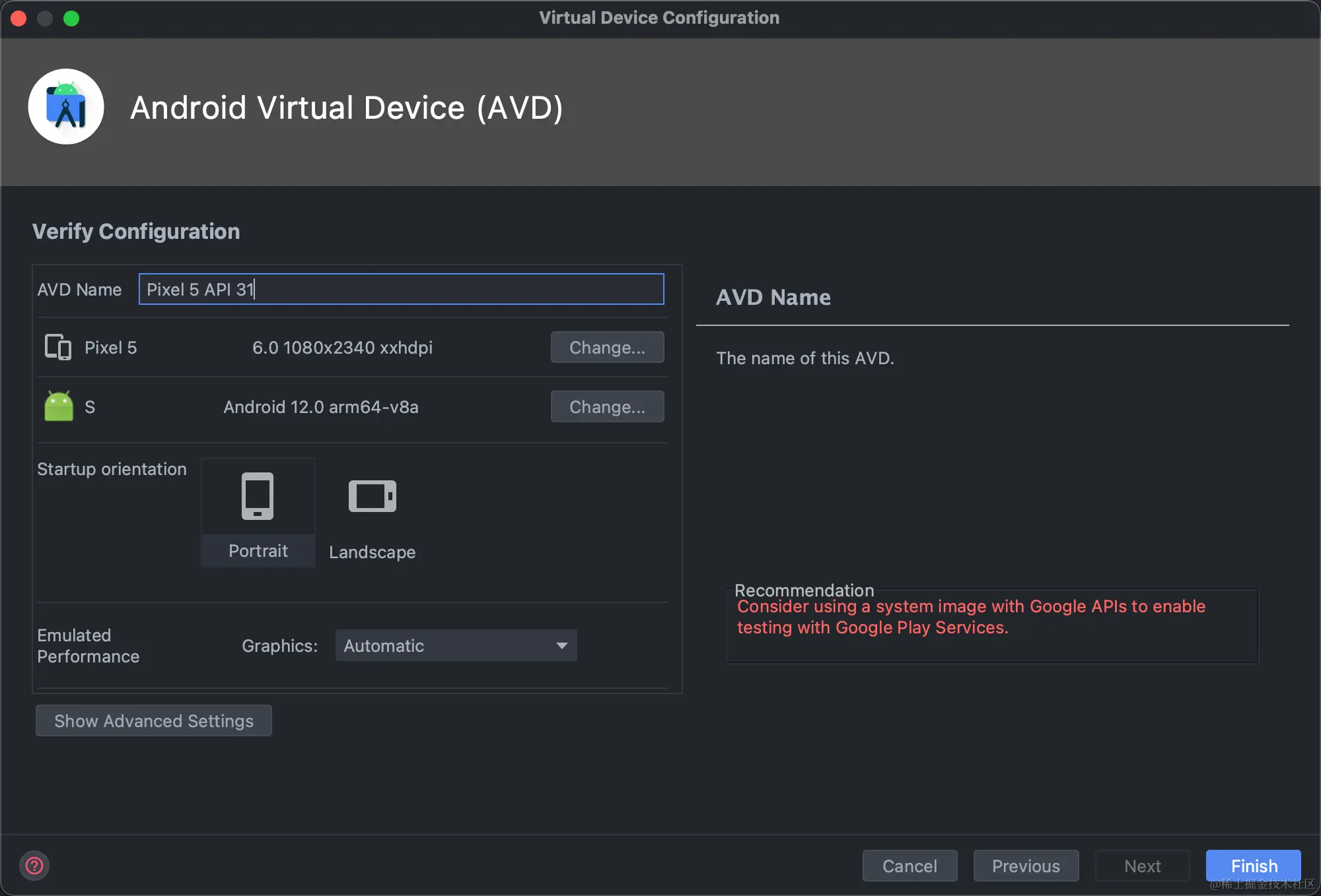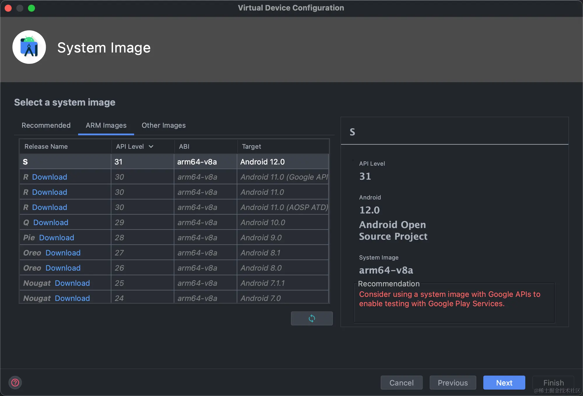 - 创建任意安卓项目,选择Device Manager。选择你喜欢的尺寸和Android版本。如果是Apple M1/M2的Mac,请一定选择Arm Images。点击版本旁边的Download下载该镜像。下载完成后点击Next、输入用户名创建模拟器。