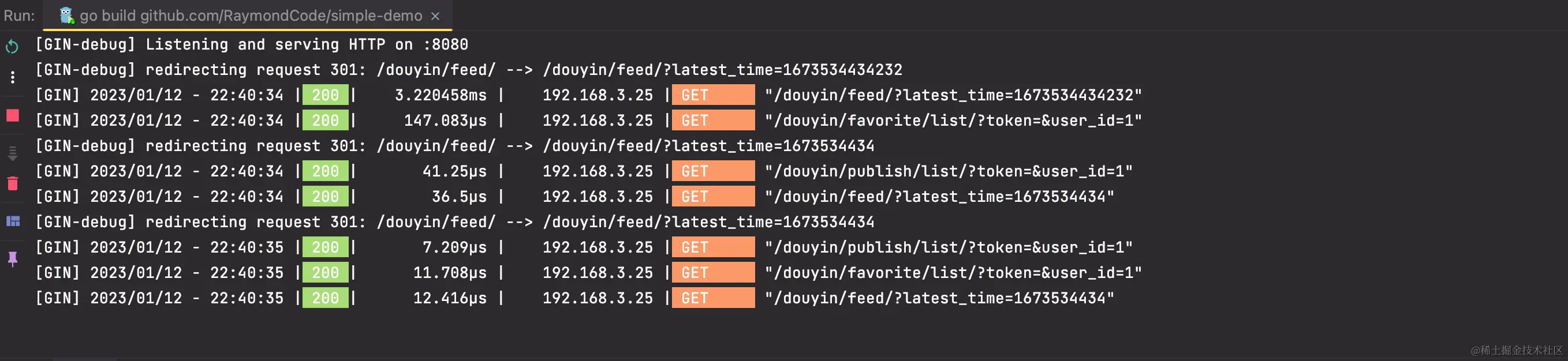 使用Go语言的Gin框架开发,包含用户模块、视频流模块、互动模块和社交模块四部分。