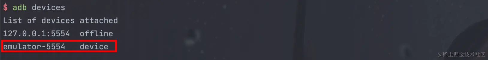 - 输入adb devices查看所有在线设备,其中就包含着设备emulator-5554,即我们刚创建并启动的模拟器。