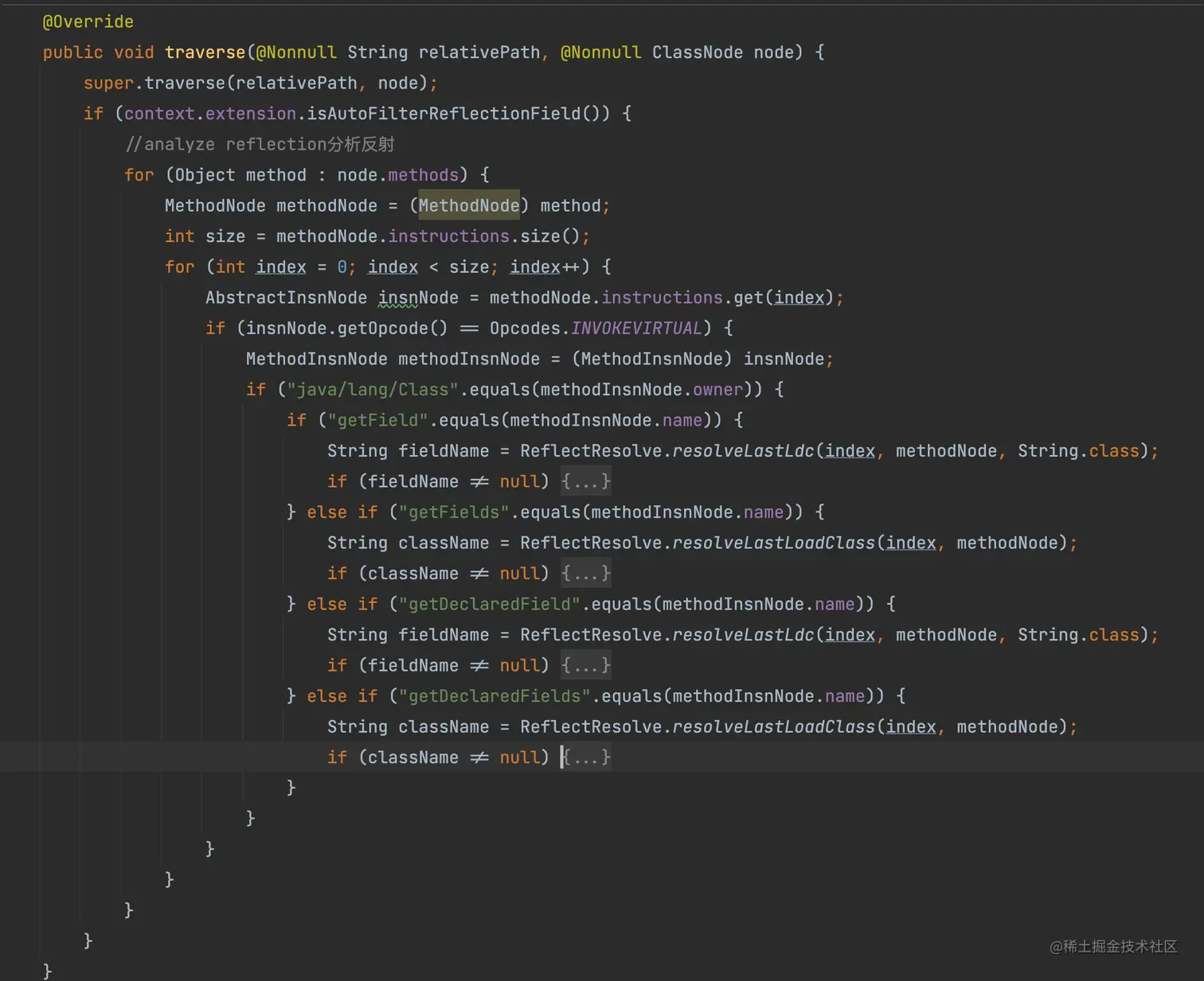 该方法主要是用来反射分析,或许所有反射的调用出,把反射调用存储到集合里,后续判断当前的常量是否被引用到了反射里,如果被反射调用了,则不进行内联。