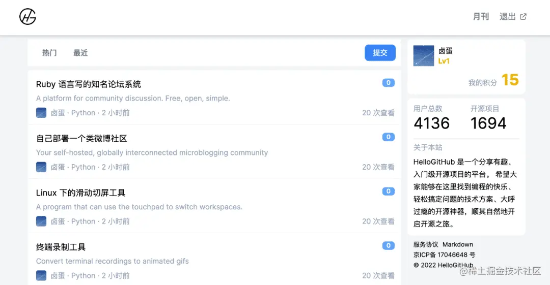 随着编程技术的不断发展,当年构建网站用的技术栈已经有些过时了,再加上之前网站的内容是围绕月刊而不是开源项目构建,很难再开发更多的功能,很大程度上限制了它的发展。所以我在 2022 年初的时候,决定彻底重构 HelloGitHub 网站,将它做成一个围绕开源项目的社区,用户可以在里分享、评论、打分开源项目,就像开源项目的豆瓣。