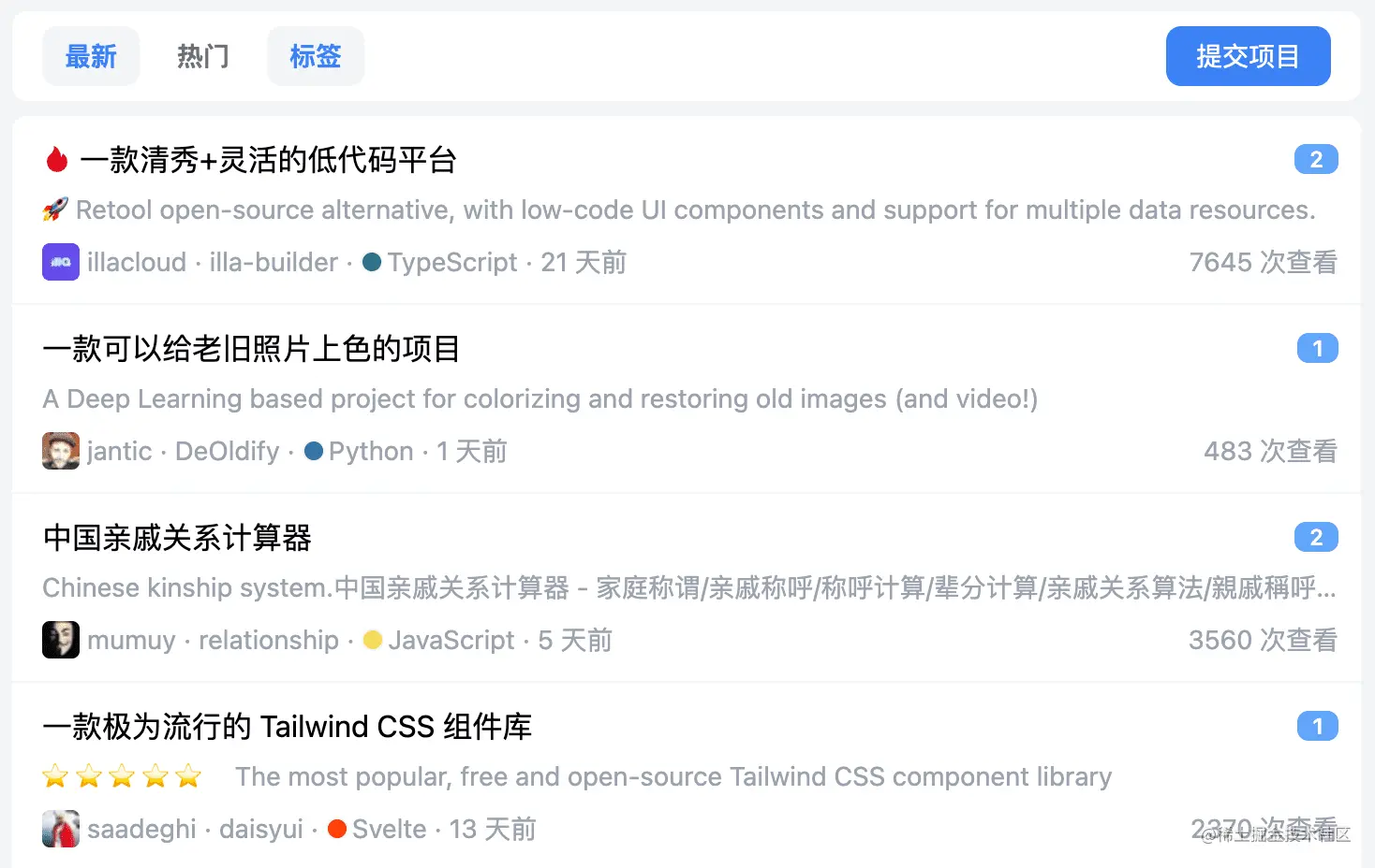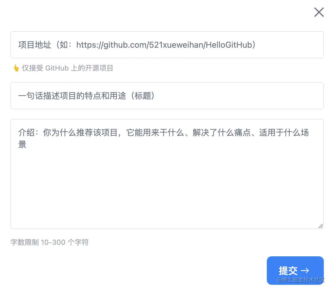 分享项目的按钮分别在首页「提交项目」和月刊「推荐」,现在分享开源项目时只要输入想要分享的项目链接,就能立刻检测出项目是否被推荐过,不仅可以有效地防止项目重复推荐,还可以避免最后提交时才发现项目已经推荐过,白写推荐语的悲剧。
