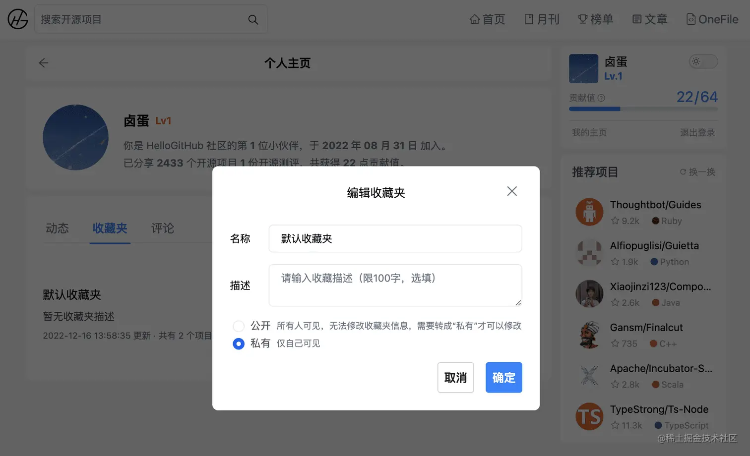 重头戏来了,通过「我的主页」可以进入到个人首页,这里有你的贡献值动态、评论记录、收藏的项目,而且收藏夹不仅可以自己看,还可以支持「公开收藏夹」从而让更多人看到你精选的开源项目集。