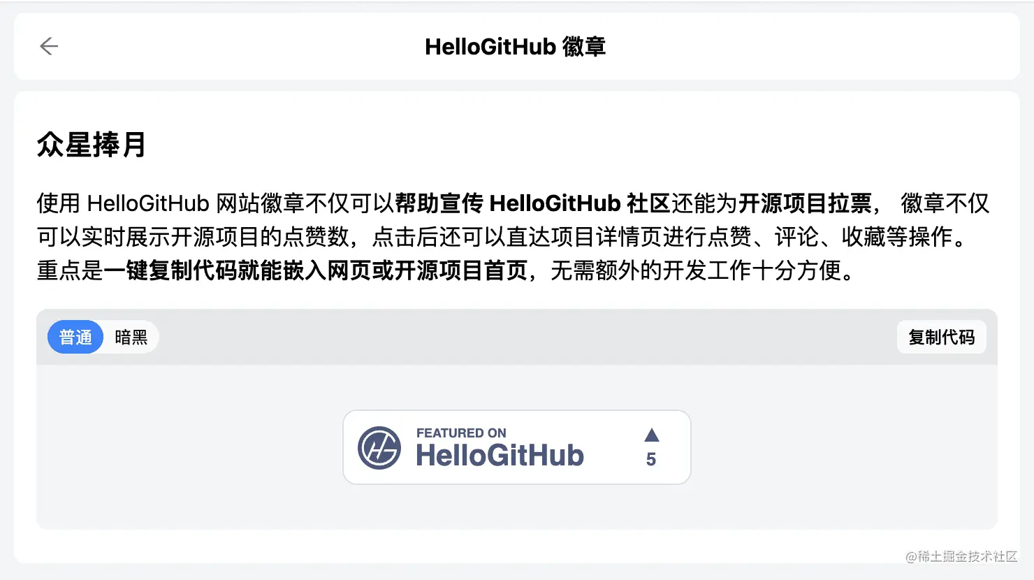 既然如此,我就想出了一个组合:你负责用代码改变世界,HelloGitHub 来为你带上奖章。所以我做了「网站徽章」的功能,用户可以通过一键复制代码,将项目在 HelloGitHub 获得的点赞数展示出去,并且点击该徽章后可直接进入到开源项目的详情页,开源项目的潜在用户不仅可以方便地查看其它使用者的评价,还可以留下自己对开源项目的看法。