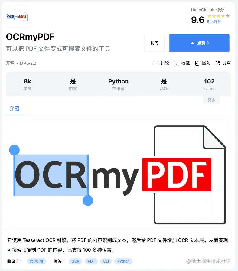 接下来,随着项目的独立「开源项目详情页」也就顺势而生,用户可以在这里查看更多关于该项目的信息,比如:项目评分、是否包含中文、主要的编程语言、是否活跃和开源协议等。