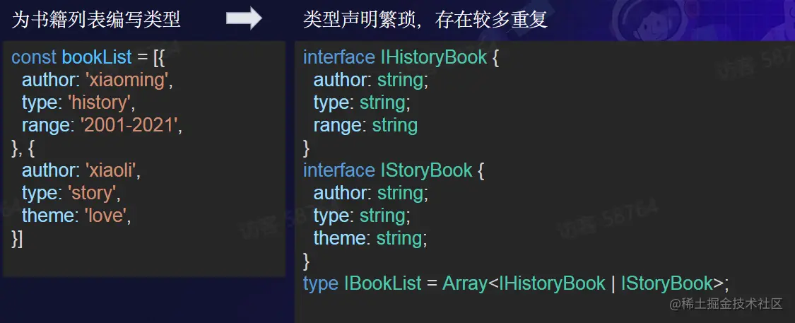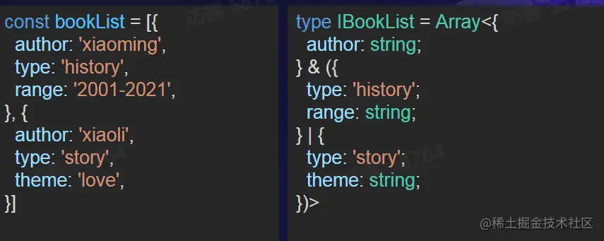 若存在一个书本列表,有两种类型的书籍,不同的书籍是通过Type进行区分,比如说历史书有一个时间范围,小说有一个主题: