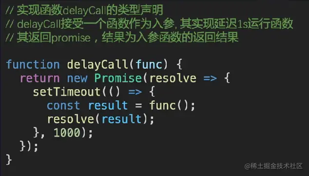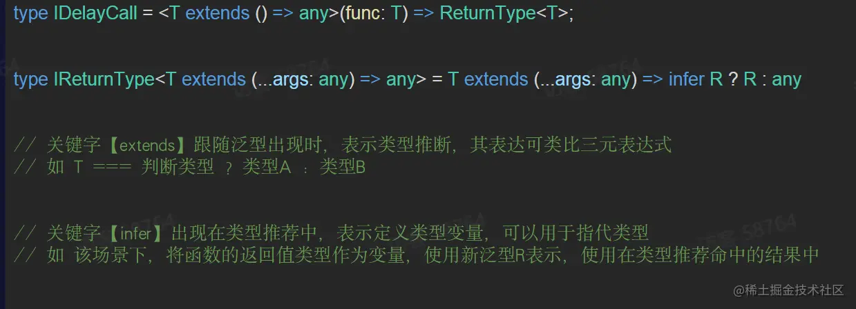 - 定义了一个IDelayCall的类型别名,该类型是一个function类型,该类型必须是一个泛型,所以需要对泛型及逆行类型限定为函数