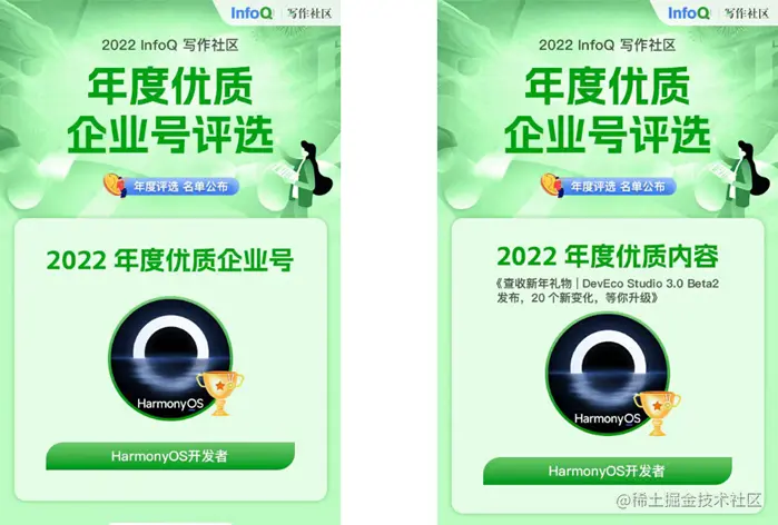 同时,1月6日infoQ写作社区公布了2022年度优质企业号评选名单,HarmonyOS开发者社区荣获“2022年度优质内容”与“2022年度优质企业号”两大奖项!