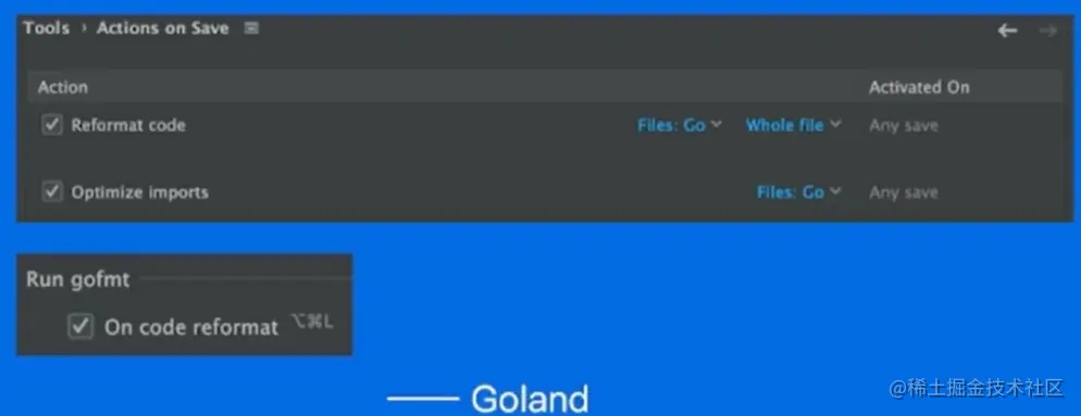 Go语言官方的工具,能够自动格式化 Go 代码。Goland 中有相关配置