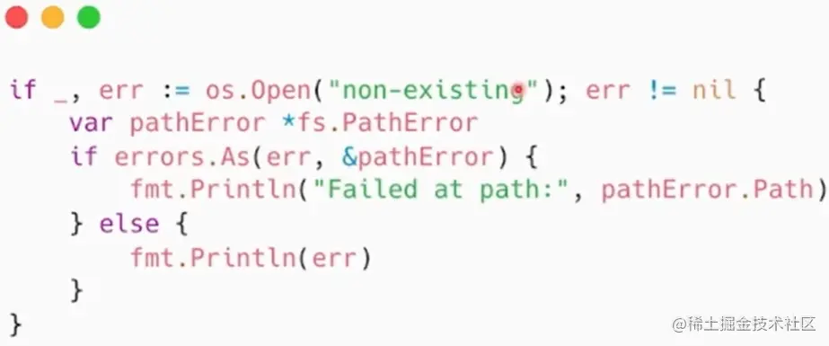 - 在错误链上获取特定种类的错误,使用 errors.As