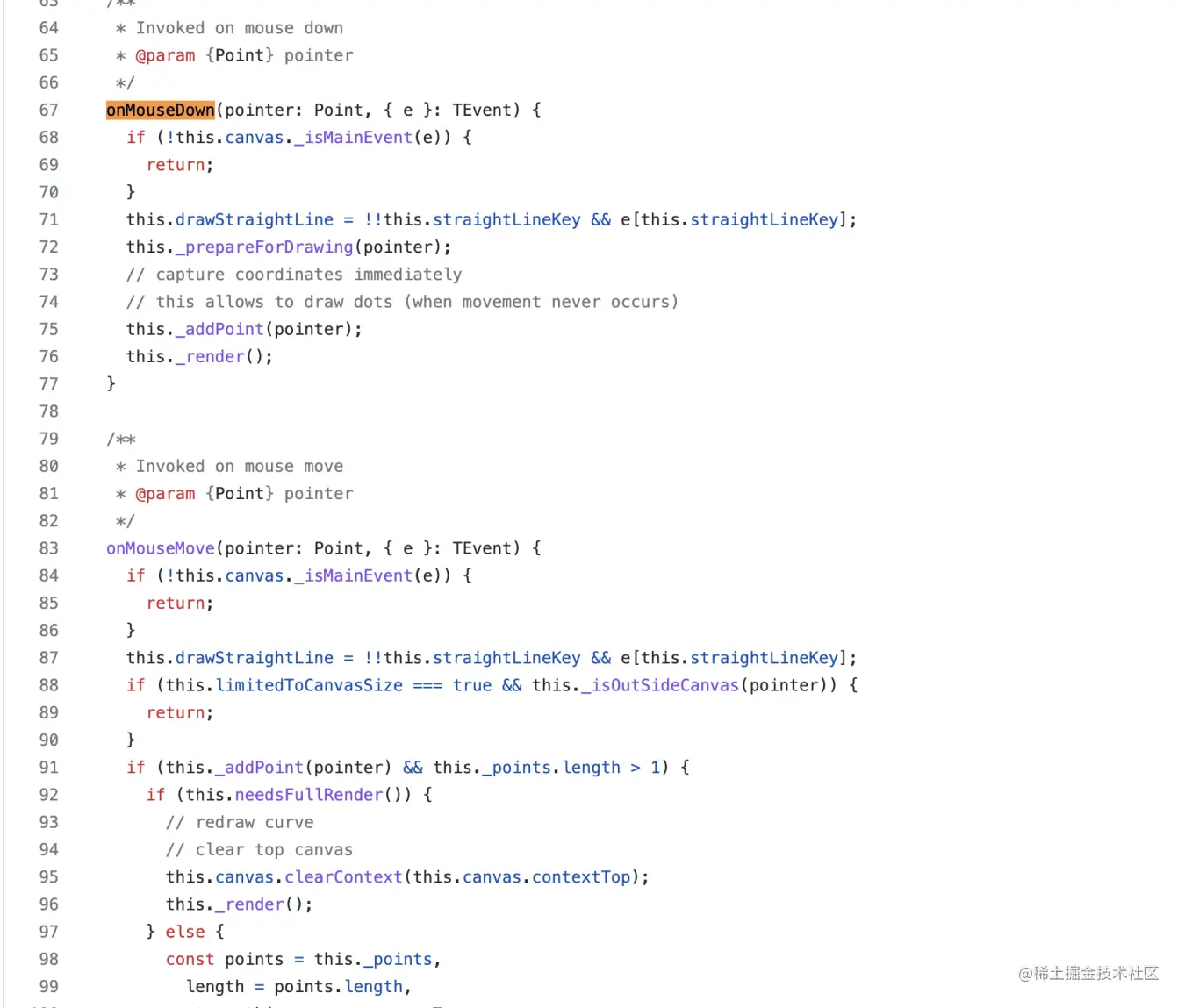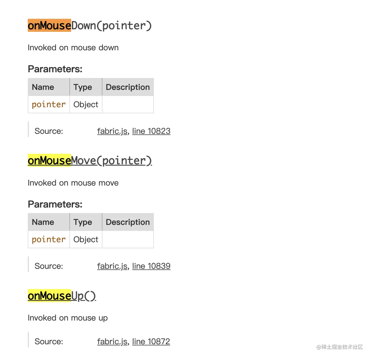 接下来翻看了下fabric.js 的源码, onMouseDown, 和onMouseDown 分别需要传递2个参数, 这里应该是文档没有及时更新导致
