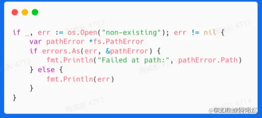 - 在错误链上获取特定种类的错误,使用errors.As