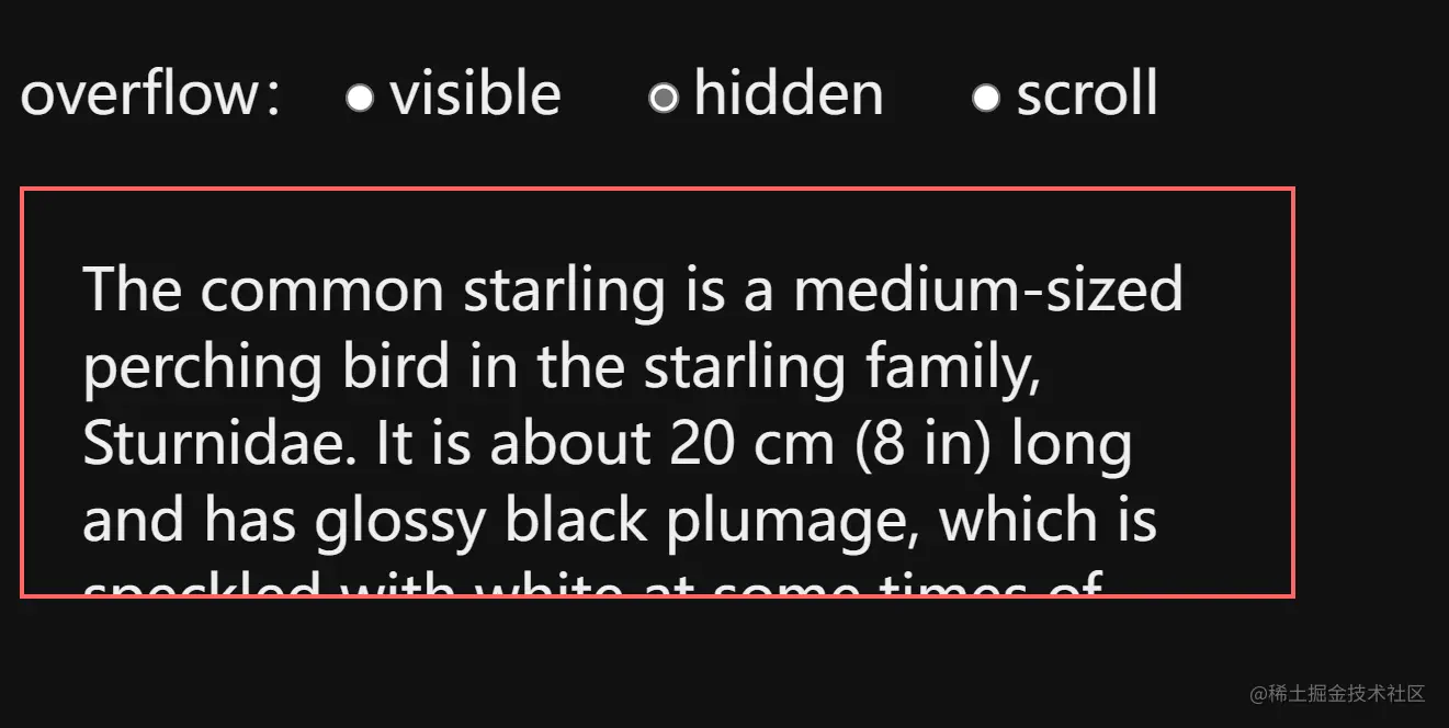确定如何向用户发出未显示的溢出内容信号。它可以被剪切,显示一个省略号或显示一个自定义字符串。