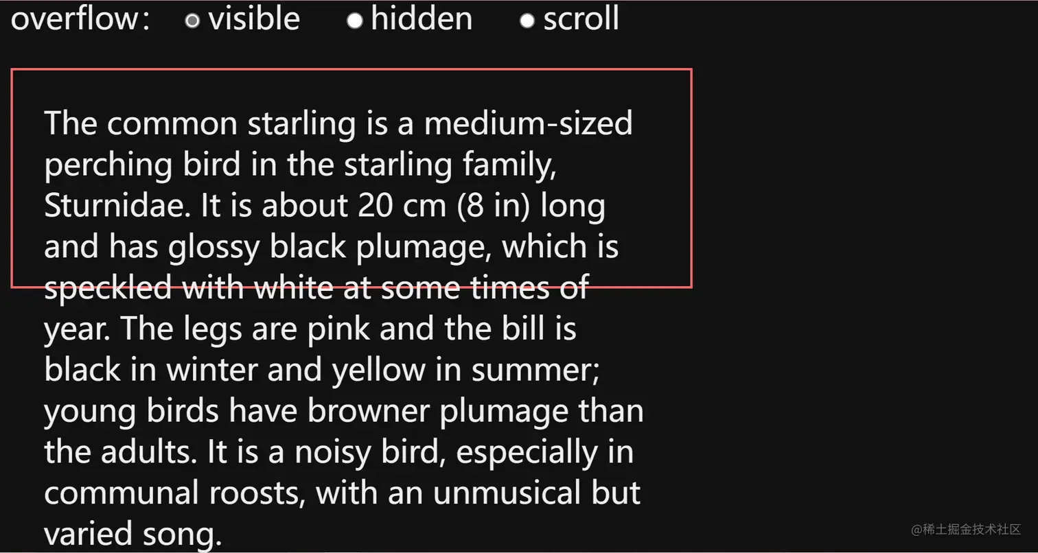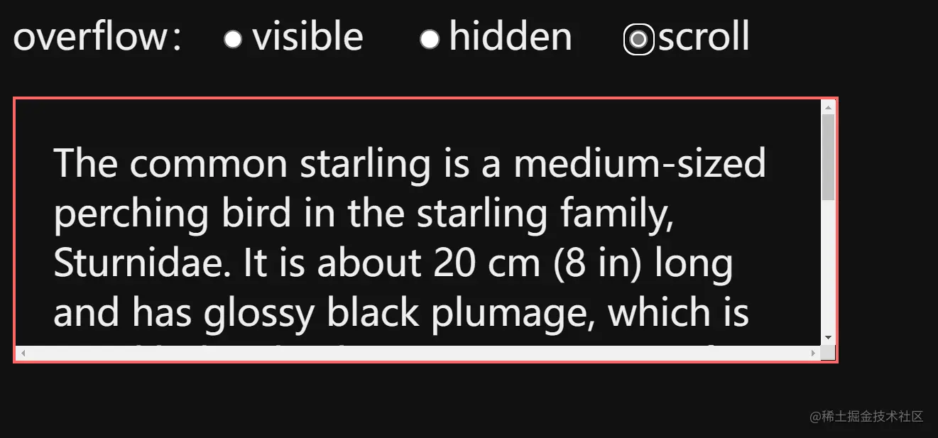定义当一个元素的内容太大而无法适应 块级格式化上下文 时候该做什么。它是 overflow-x 和overflow-y的 简写属性 。