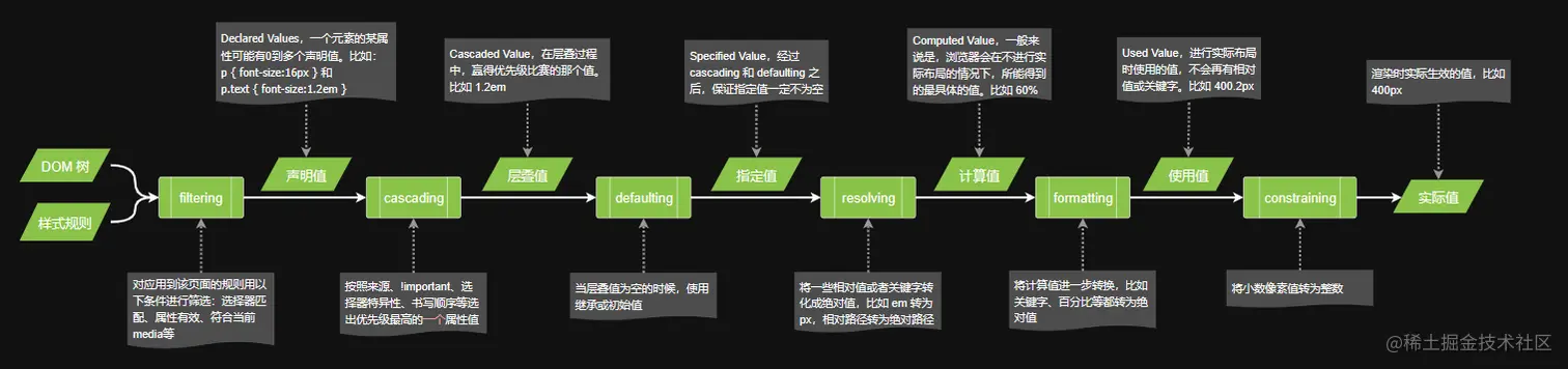 - 指定值 specified value 取自样式层叠 (选取样式表里权重最高的规则), 继承 (如果属性可以继承则取父元素的值),或者默认值。