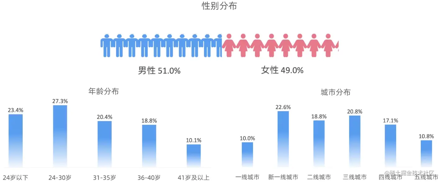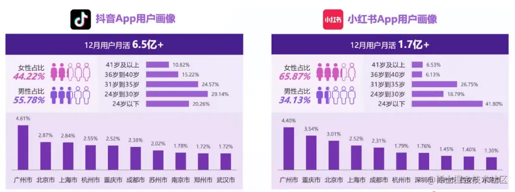 *抖音用户中男性比例稍高于女性,达到55%; 30岁以下年轻用户占比接近50%,地域分布以新一线城市、三线以上城市居多,呈现出一定下沉特征。 *