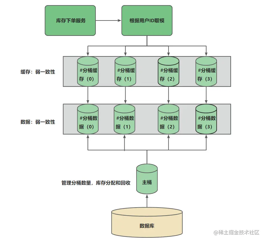 - 主桶和分桶留有一定冗余库存,分桶库存不足时可以向主桶申请;