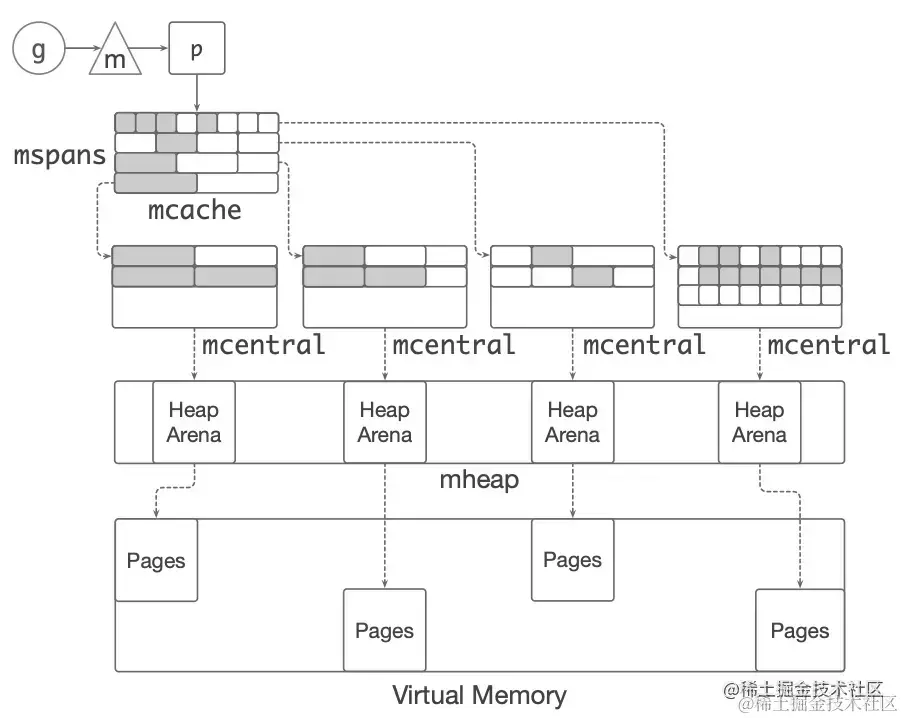 - Go 内存管理构成了多级缓存机制,从 OS 分配得的内存被内存管理回收后,也不会立刻归还给 OS,而是在 Go runtime 内部先缓存起来,从而避免频繁向 OS 申请内存。内存分配的路线图如下。