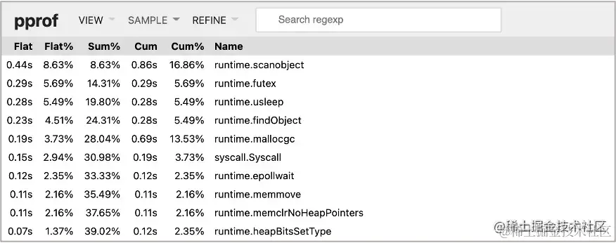 可以看到,用于分配对象的函数 mallocgc() 占用 CPU 较高
