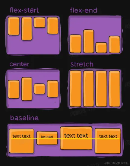 align-items:将所有直接子节点上的align-self值设置为一个组。 align-self属性设置项目在其包含块中在交叉轴方向上的对齐方式。