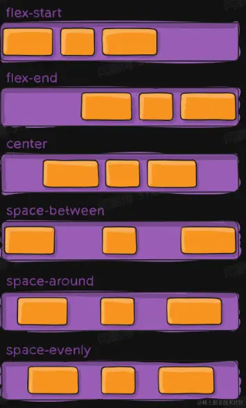 justify-content:定义了浏览器之间,如何分配顺着弹性容器主轴(或者网格行轴) 的元素之间及其周围的空间。
