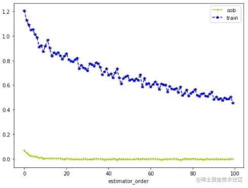 随着弱分类器的增加,训练集的损失在不断降低,袋外样本的损失减小值慢慢趋于平稳。